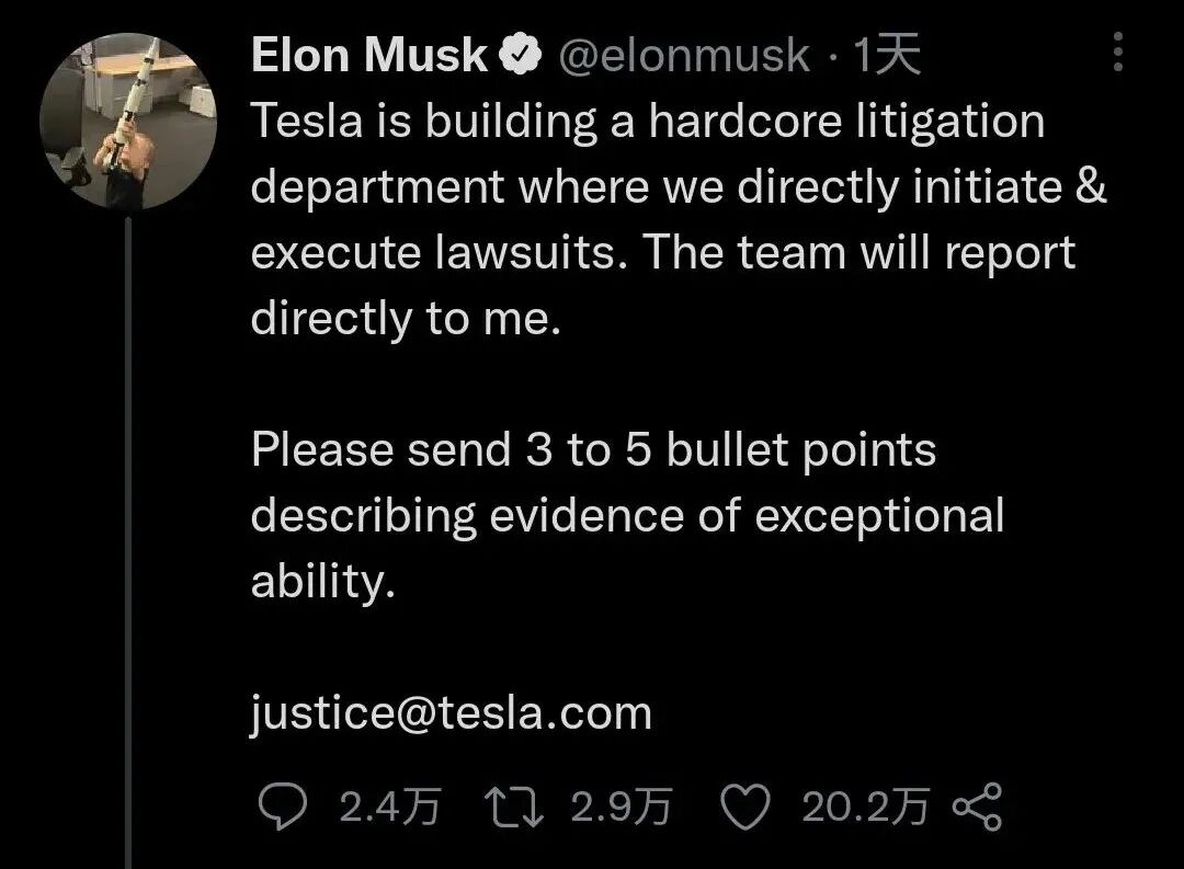 特斯拉正在组建一个“硬核诉讼部门”,直接向我汇报。