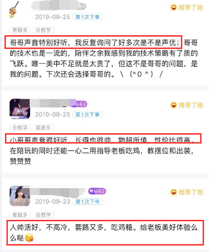 最著名的一次,就是在微博上晒出比心陪玩记录,开价“666元一局”。下面点单的妹子还纷纷给出了“哥哥声音特别好听”、“哥哥的技术一流”、“人帅活好”等等的好评。