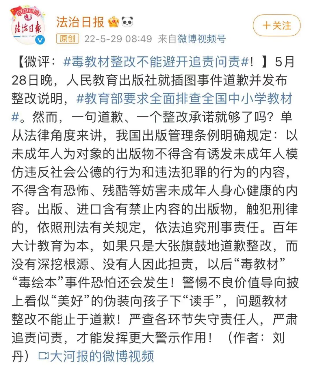 正如@法治日报 所评,百年大计教育为本,“问题教材整改不能止于道歉!严查各环节失守责任人,严肃追责问责,才能发挥更大警示作用!”