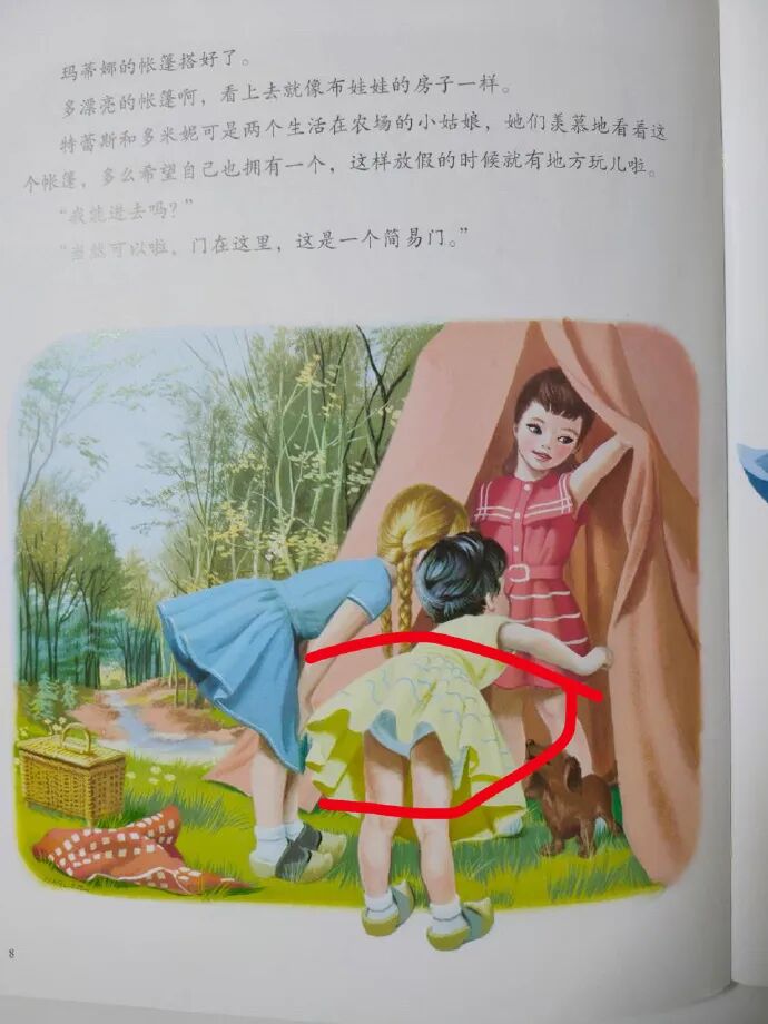 在一本名为《怪事多多》的绘本中,出现了小狗舔女孩屁股的画面。