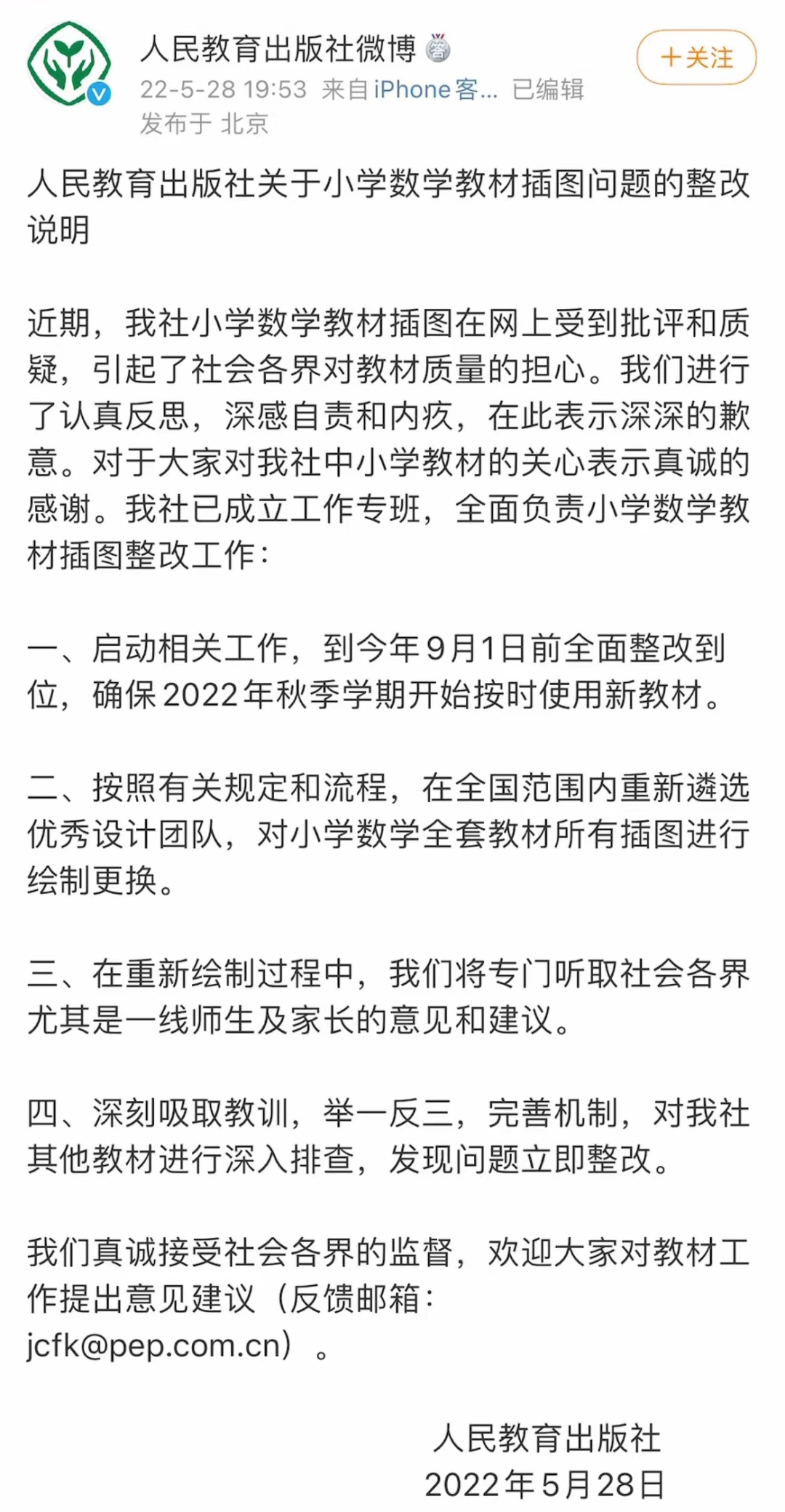 随后,人教社就教材插图致歉,表示深感自责和内疚。并表示已启动相关整改工作,确保2022年秋季学期开始按时使用新教材。