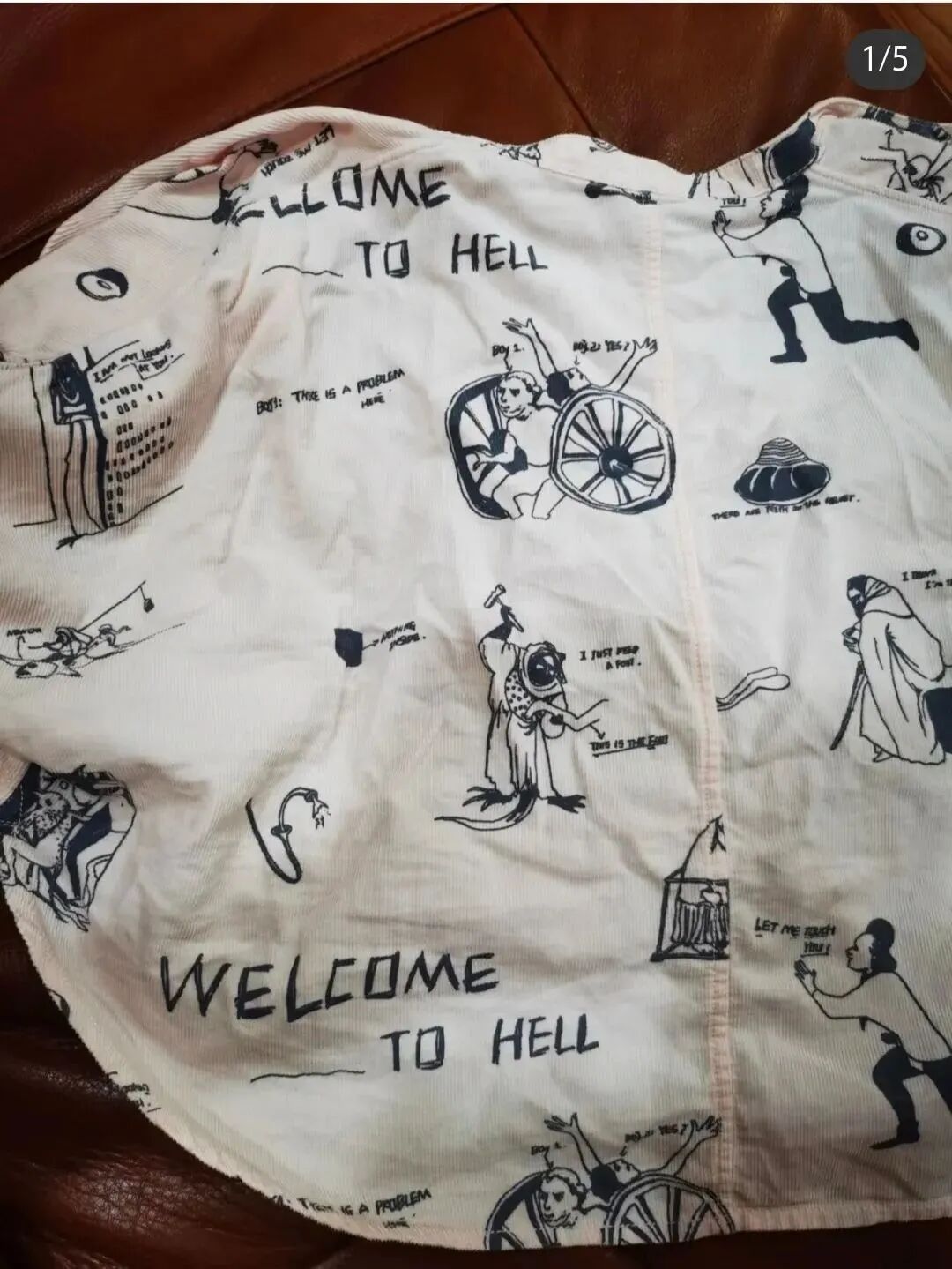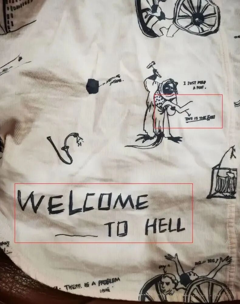 比如下面这一件就印有“WELCOME TO HELL”(欢迎来到地狱)、“LET ME TOUCH YOU”(让我摸摸你)的字样,还配有骷髅头、疑似车裂和钉锤酷刑等诡异图案。