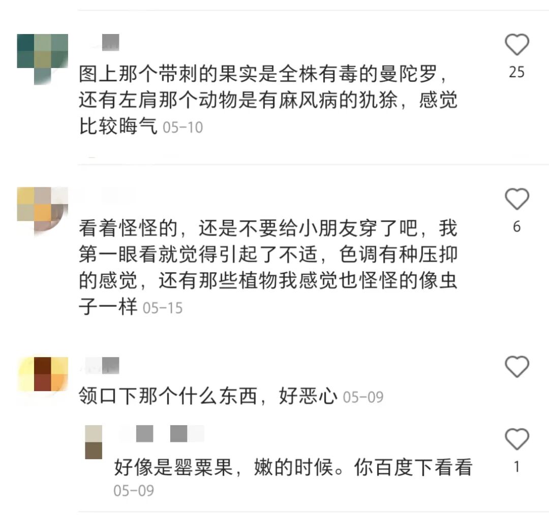结果不少网友认为衣服上的图案比较怪异,像是“曼陀罗”、“罂粟”等毒性植物、还有一些患病的动物,整体色调也偏暗,十分压抑,并不适合给儿童穿。