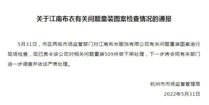 5月31日,市区两级市场监管部门对江南布衣服饰有限公司有关问题童装图案进行现场检查,现已责令该公司对相关问题童装509件做下架处理,下一步将会同有关部门进一步调查并依法严肃处理。