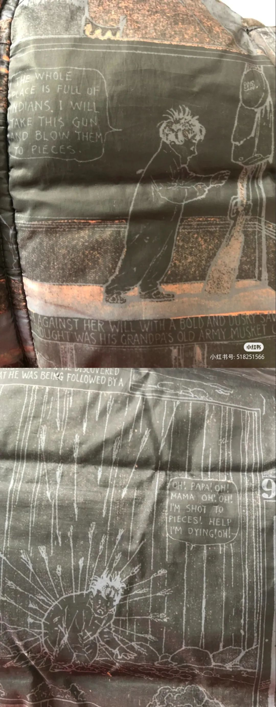 还有下面这件羽绒服上的“万箭穿心”,文案的翻译大概是: