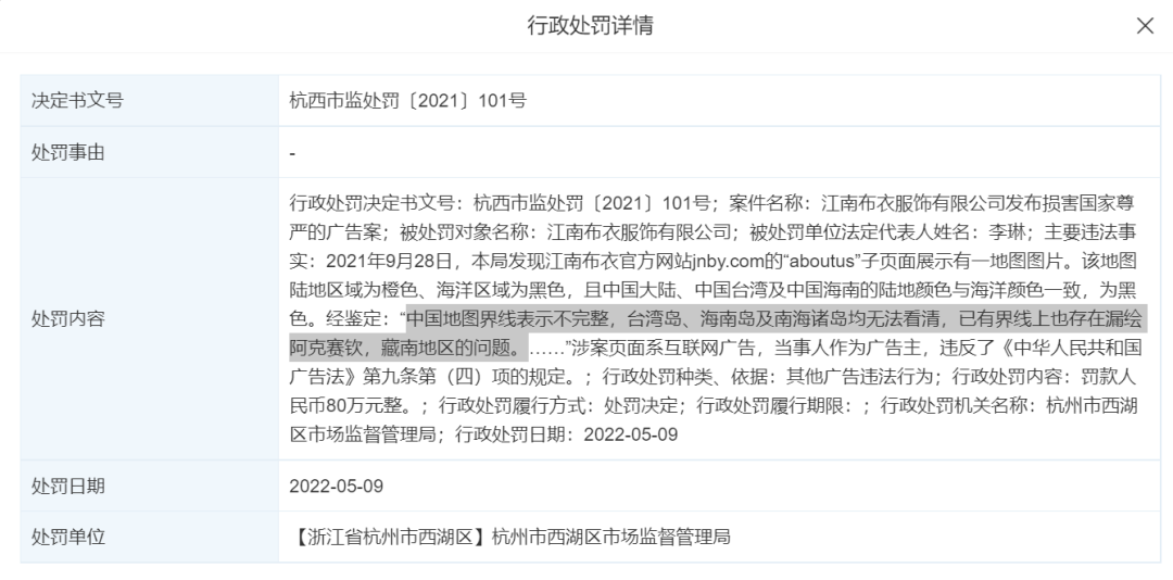 西湖区市场监督管理局做出的处罚决定称,2021年9月28日,该局发现江南布衣官方网站子页面展示有一地图图片。该地图陆地区域为橙色、海洋区域为黑色,且中国大陆、中国台湾及中国海南的陆地颜色与海洋颜色一致,为黑色。