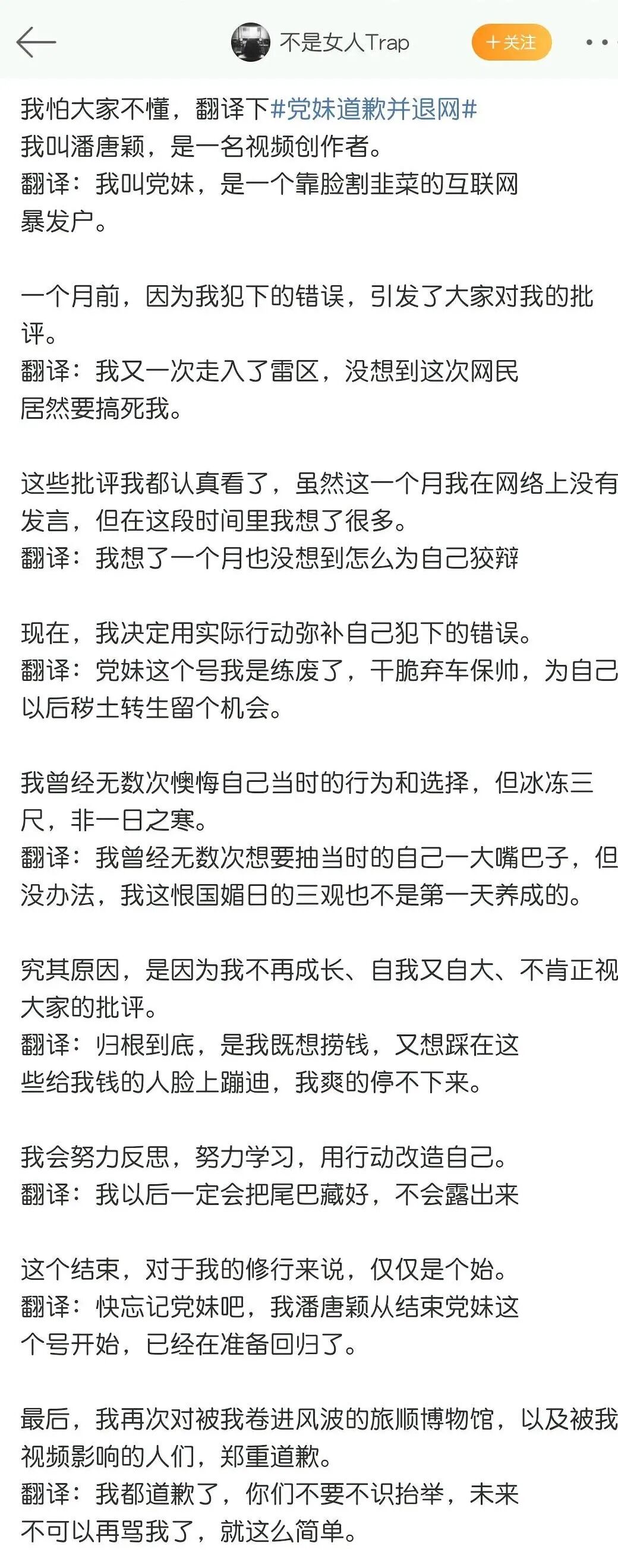 B站UP主@机智的党妹 (本名潘唐颖)发布长文,宣布清空全网ID、下架所有视频并退网。