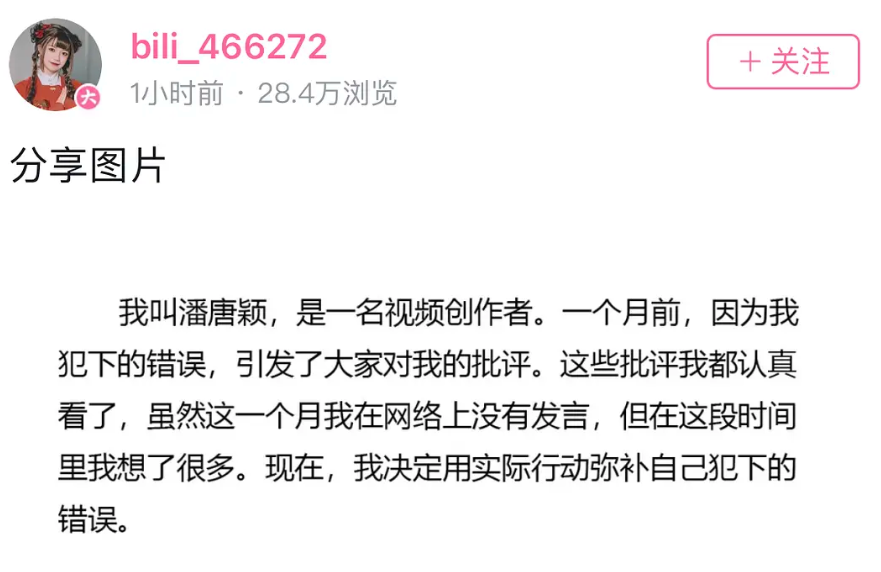 “党妹”在长文中表示,“决定用实际行动弥补自己犯下的错误”: