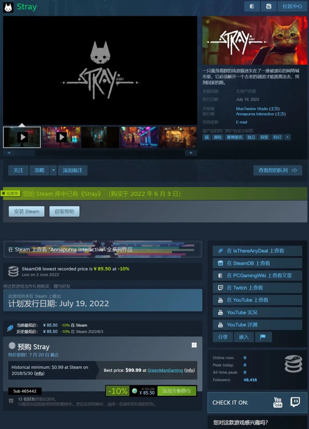 目前《流浪》在Steam已经开放预购,定价95元,正式发布前可享受九折优惠,售价85.5元。