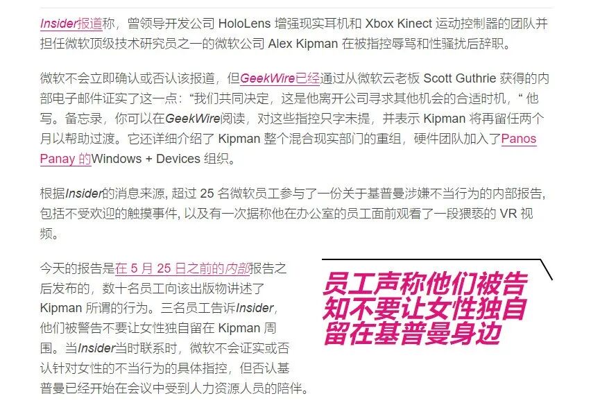 据《商业内幕》报道,一共有超过25名微软员工参与指控,Alex Kipman多次对女员工做出不当行为,如不合适的肢体接触等,其中就包括这次在办公室当着员工的面观看淫秽VR视频:
