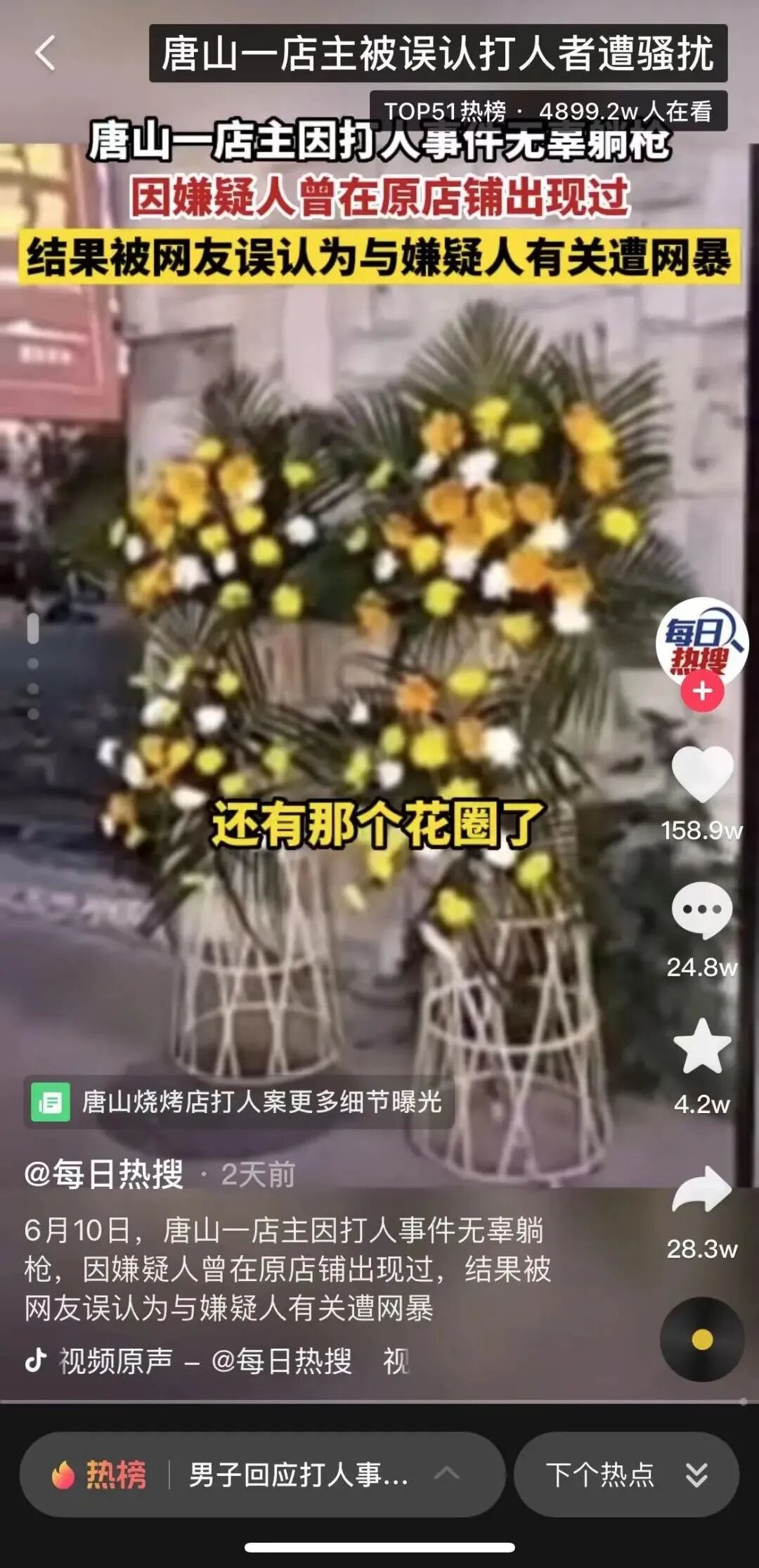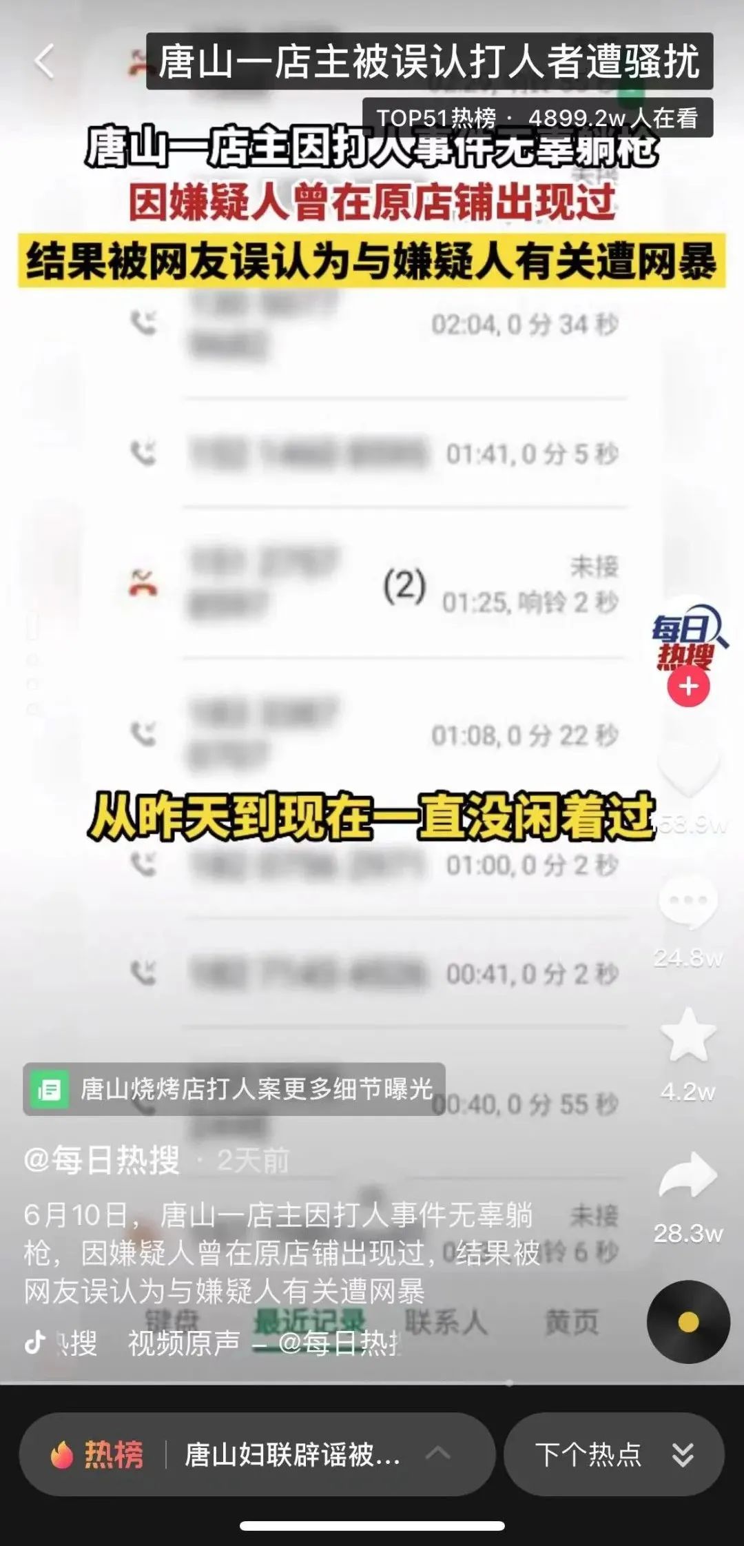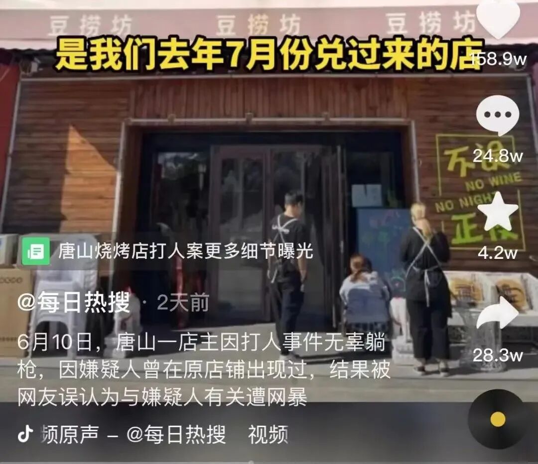 除了事发烧烤店,数十家位于唐山烧烤一条街的烧烤店都遭到了网络暴力。