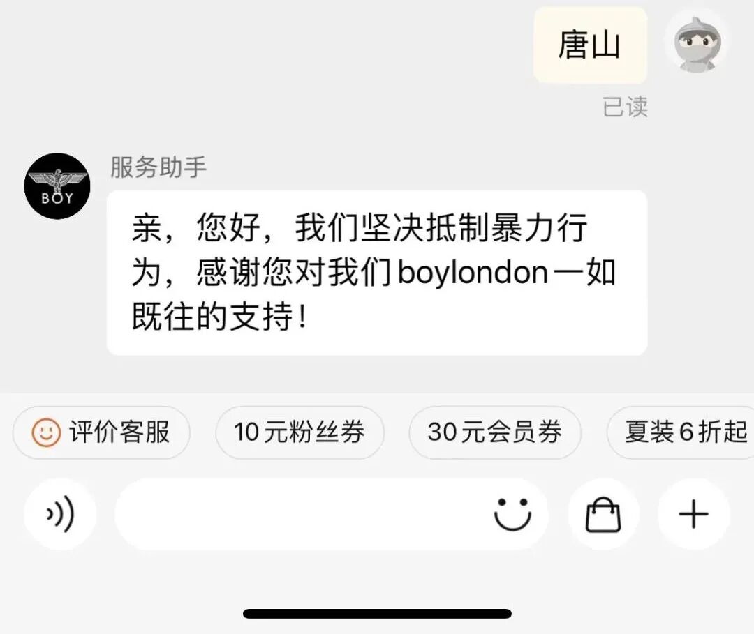 遭网暴后,品牌方也是求生欲满满,客服后台输入唐山、打人等相关字样,直接自动回复“坚决抵制暴力行为”。