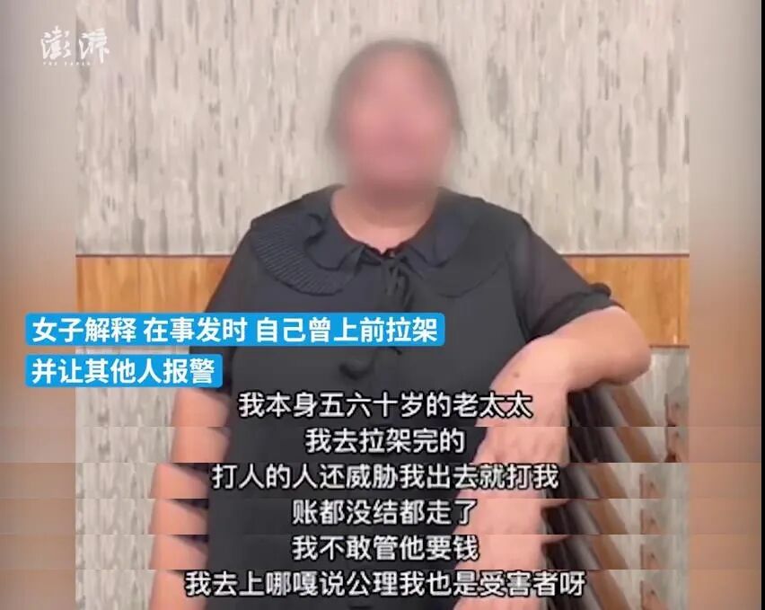 老板娘表示,事发时曾上前拉架还遭到了打人者的威胁,说“出去就打我”。当时在屋里保护一个人,自己没带手机,就让他报警了。