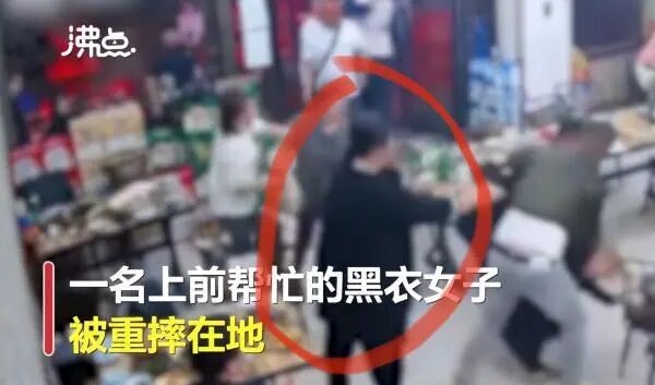 从现场视频可以看到,确实有一黑衣女子从柜台上前拉住打人者。