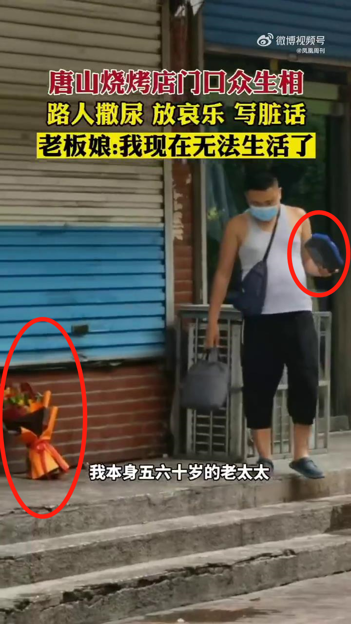 6月12日,一位穿白色背心的男子来到事发烧烤店门口,解小便、放哀乐、并写字辱骂。