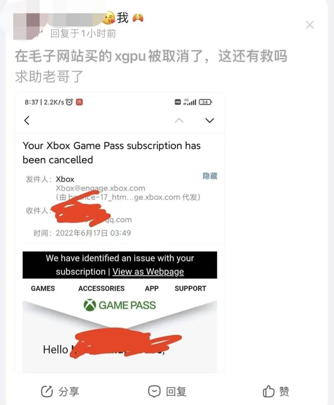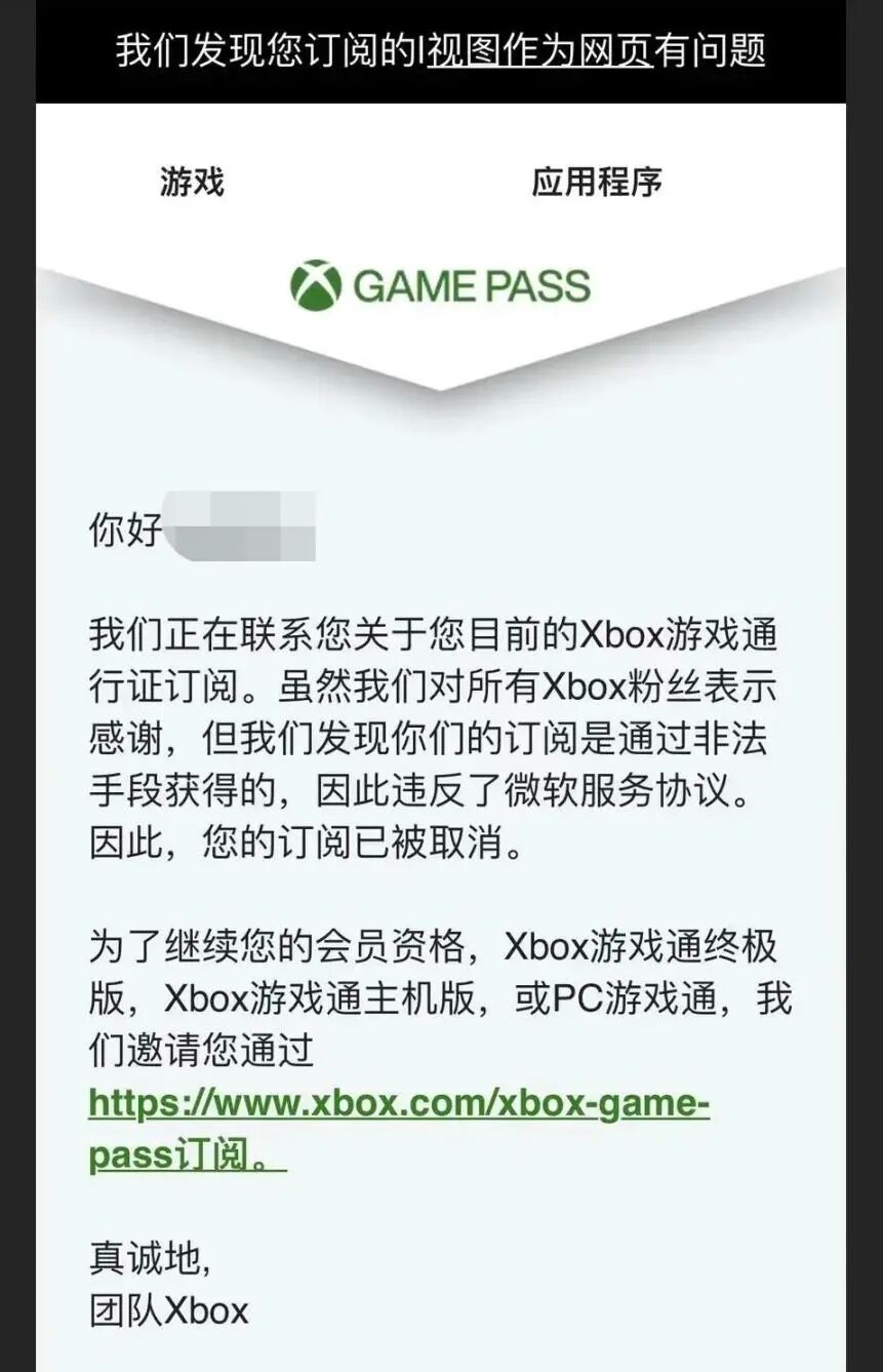 结果!从昨天晚上开始,有不少玩家在贴吧、论坛反映,自己收到了微软官方发来的邮件,显示自己购买的XGP订阅服务因为“订阅是通过非法手段获得的”被官方取消!
