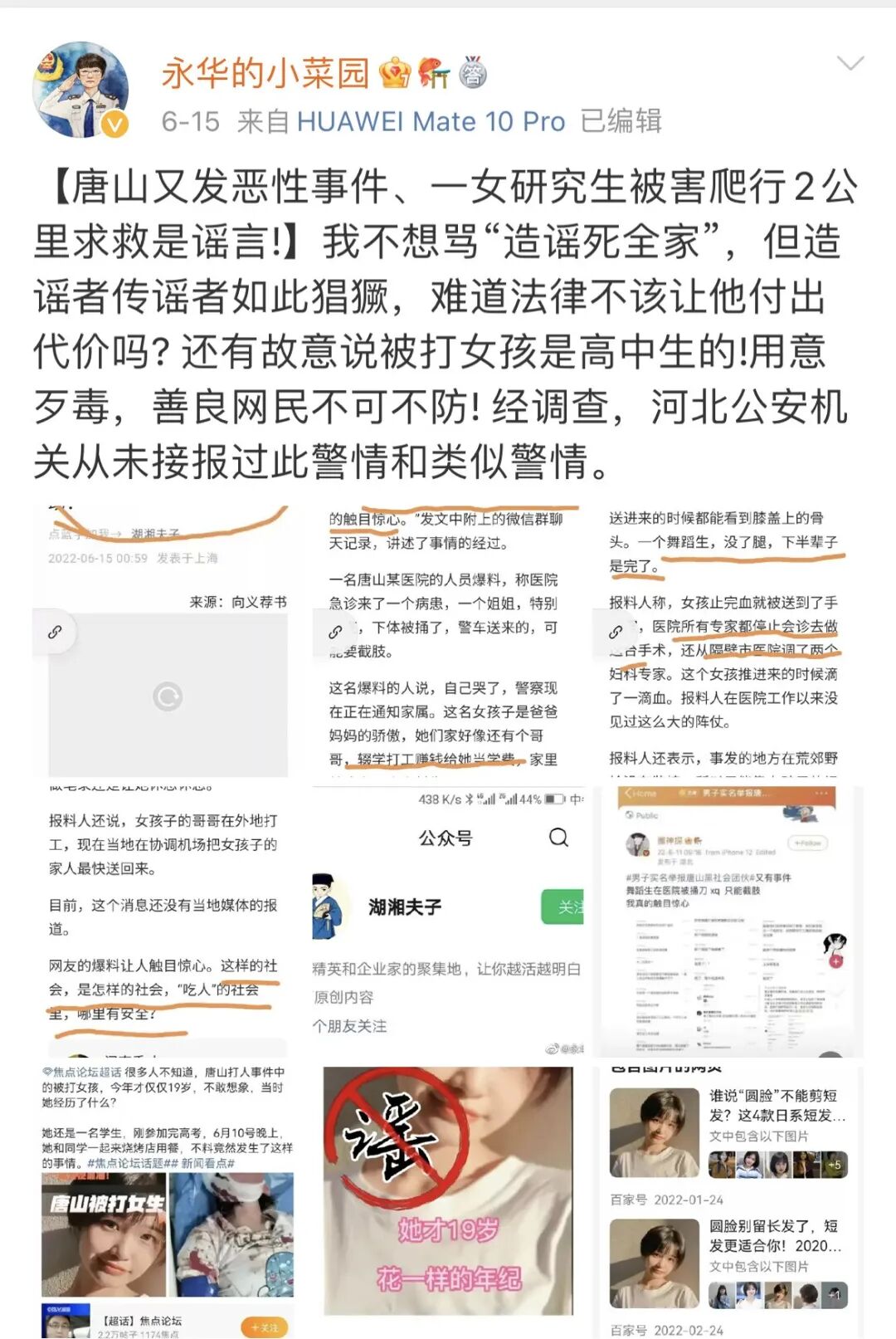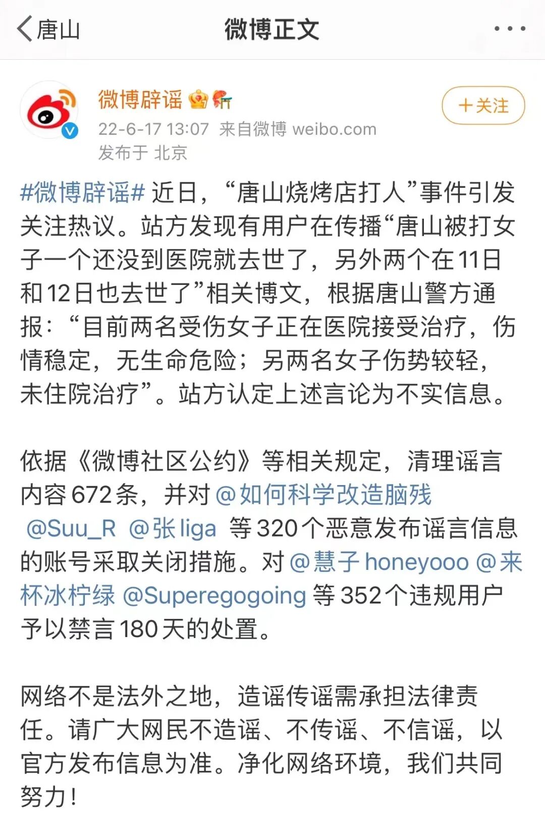 单单是微博一个平台,最近就清理了“唐山烧烤店打人”相关谣言内容672条,并对相关恶意发布谣言信息的账号采取关闭、禁言的处置。