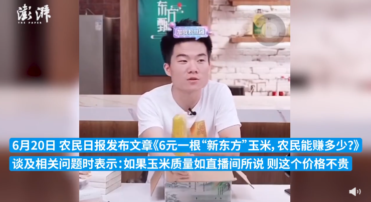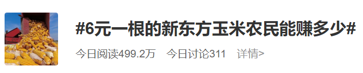 昨日,有网友质疑新东方直播一根玉米卖6元太贵了,带货农产品价格普遍较高。