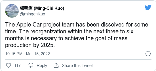 甚至苹果“爆料一哥”,著名分析师郭明錤曾在推特上称,苹果汽车团队已经“解散了一段时间”。