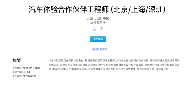苹果官网信息显示,近期苹果正在北京、上海、深圳三地招聘汽车体验合作伙伴工程师。