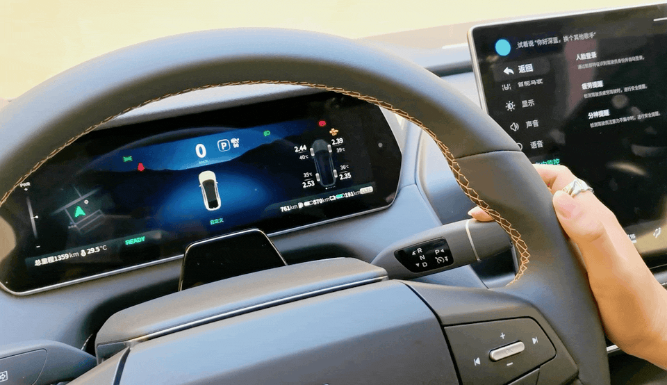首先一上车,深蓝SL03自动调整电动座椅💺、中控也像向日葵一样自动旋转面向驾驶员。