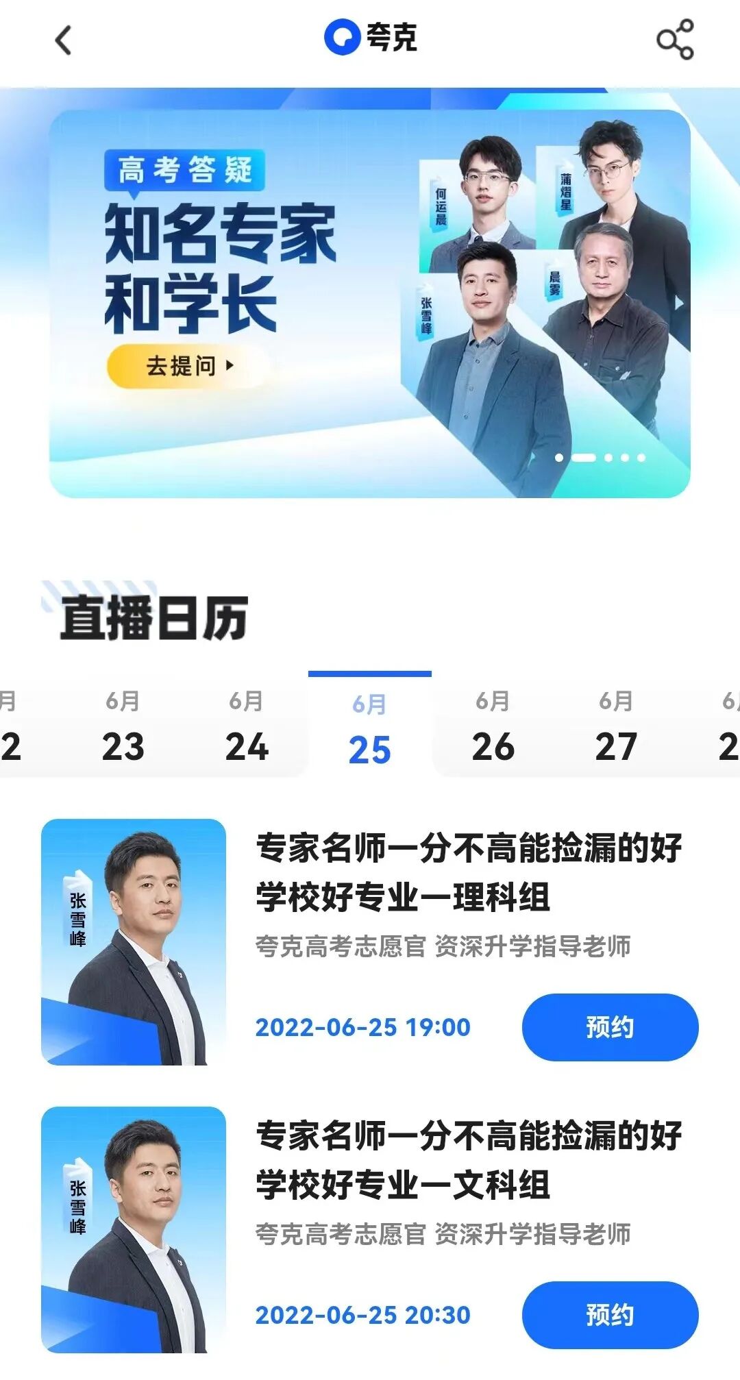 关于这个问题,夸克高考也有考虑到,通过直播日历紧盯专家直播的时间,进行在线答疑解惑。