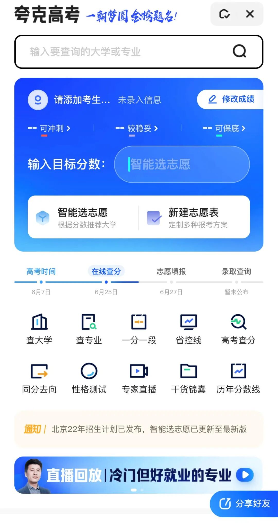 在夸克APP首页可以输入你的分数进行智能选志愿。
