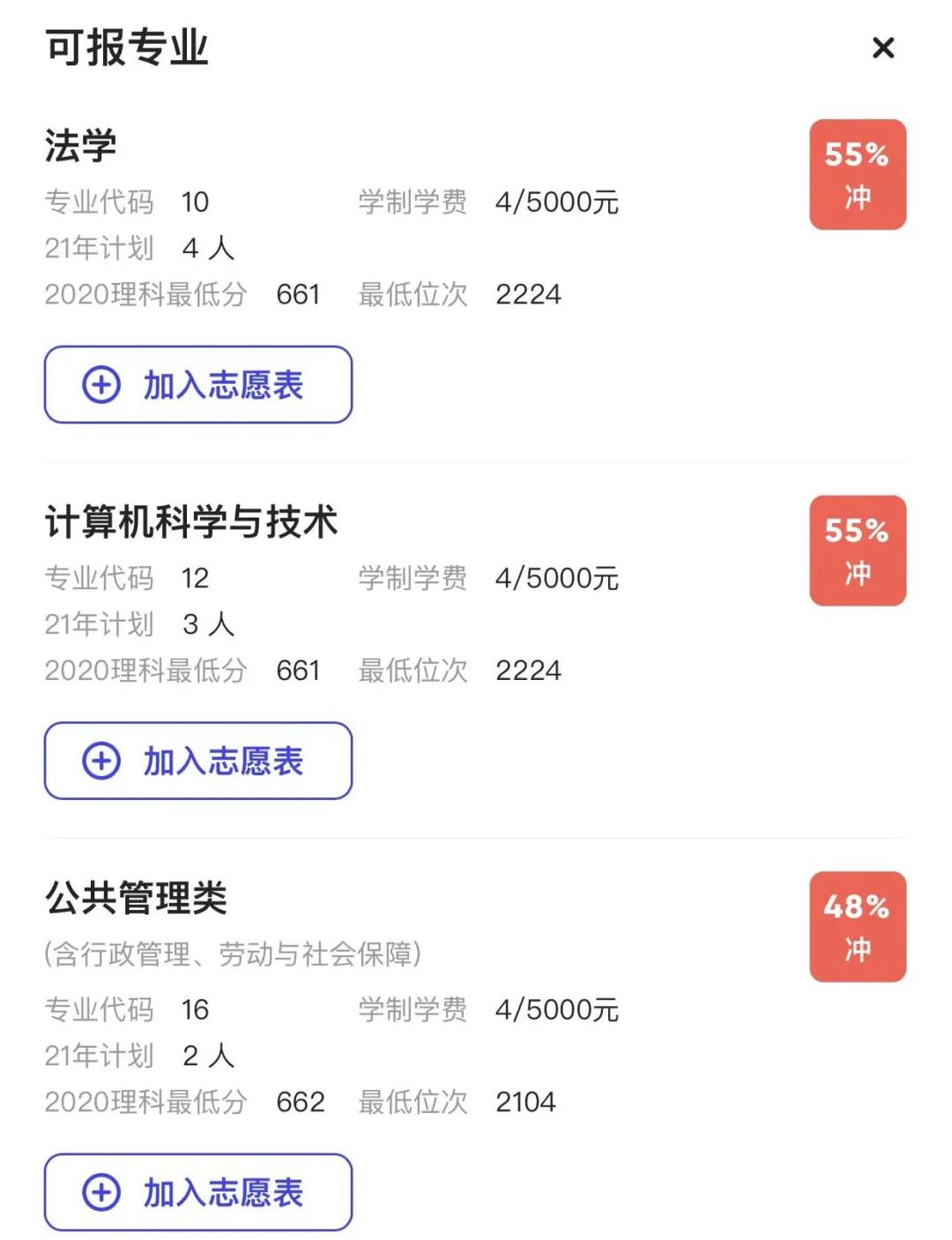 筛选出来的结果,都可以进一步查看你可报的专业,并计算出的录取概率供参考。