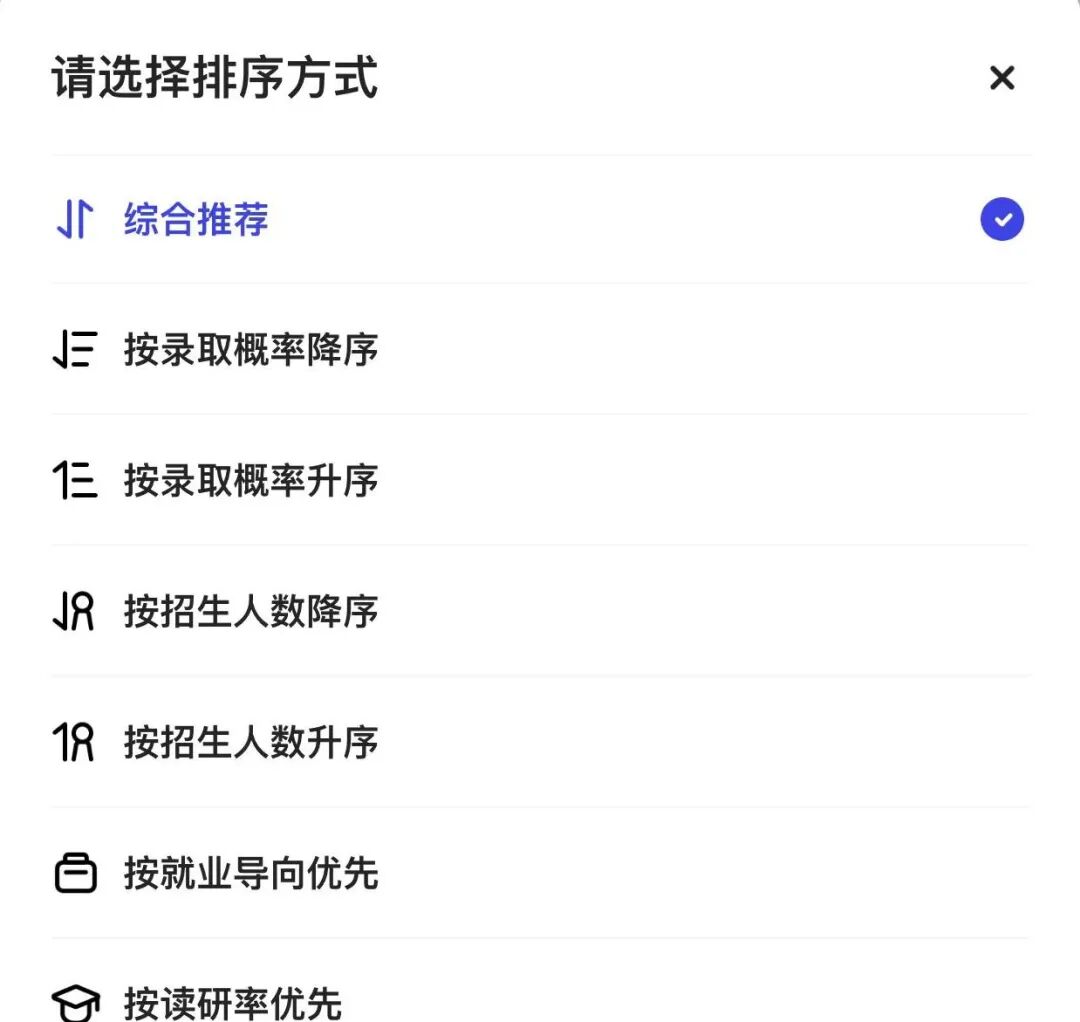 再点开下方的排序功能,从“录取率”、“招生数”、“就业导向”、“读研率”选择你更关心的点。