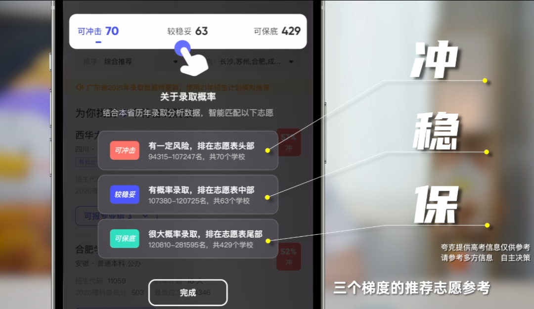 根据你填报的分数和学科,夸克会显示你的全省排名,并且按照位次数据分析检测的结果按照“可冲刺”、“较稳妥”、“可保底”三个梯度进行推荐志愿参考。