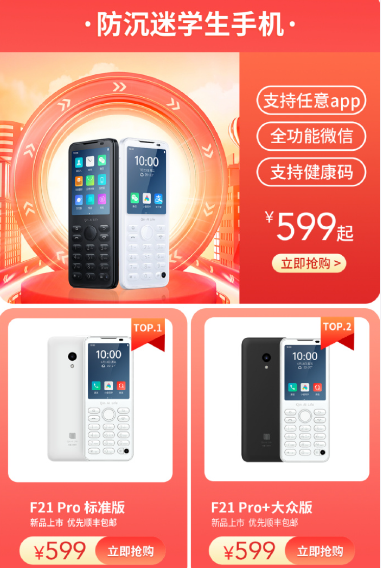 F21 Pro系列定位“防沉迷学生手机”,号称支持任意App、全功能微信、支持健康码,官方售价599元起。
