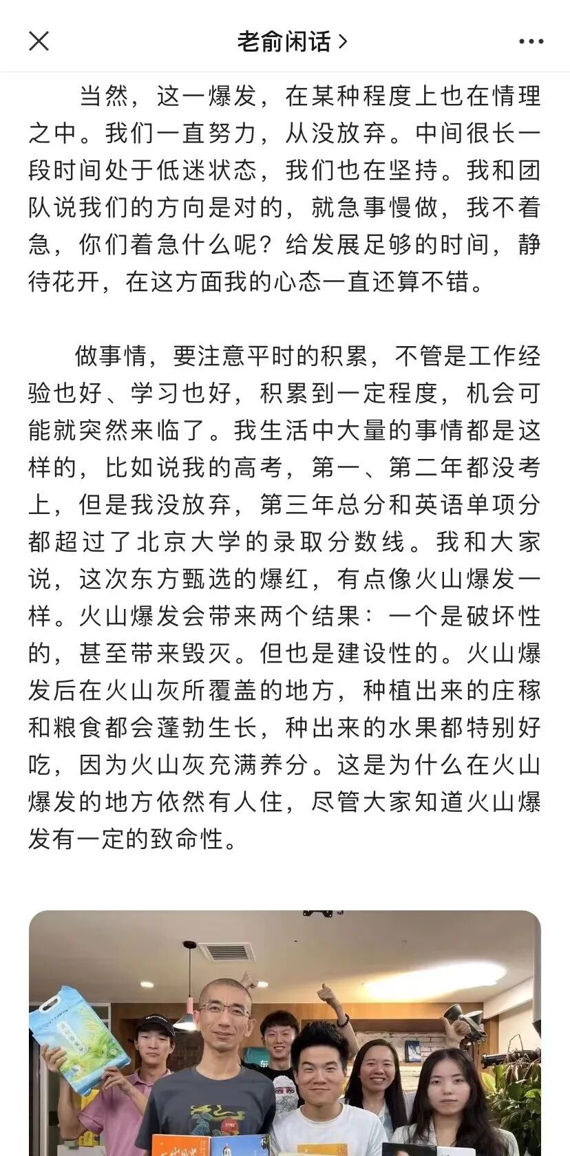 随着俞敏洪带货业绩的起飞,新东方的股价也随之上涨,对于这样的突然爆红,作为“二次创业”的俞敏洪也有很清醒的认知。