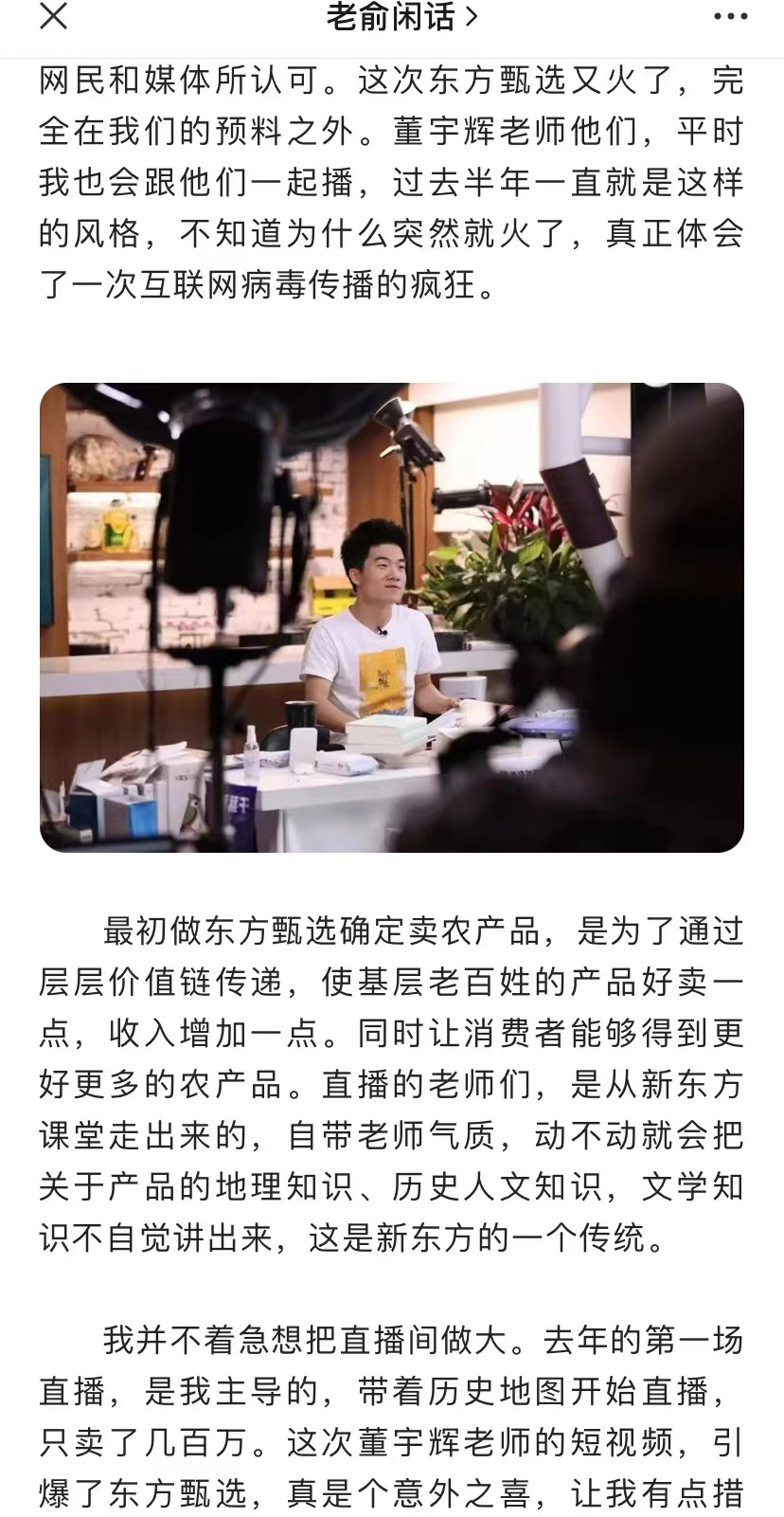 2.最初做东方甄选是为了卖农产品,是为了通过层层价值链传递,使基层老百姓的产品好卖一点,收入增加一点。