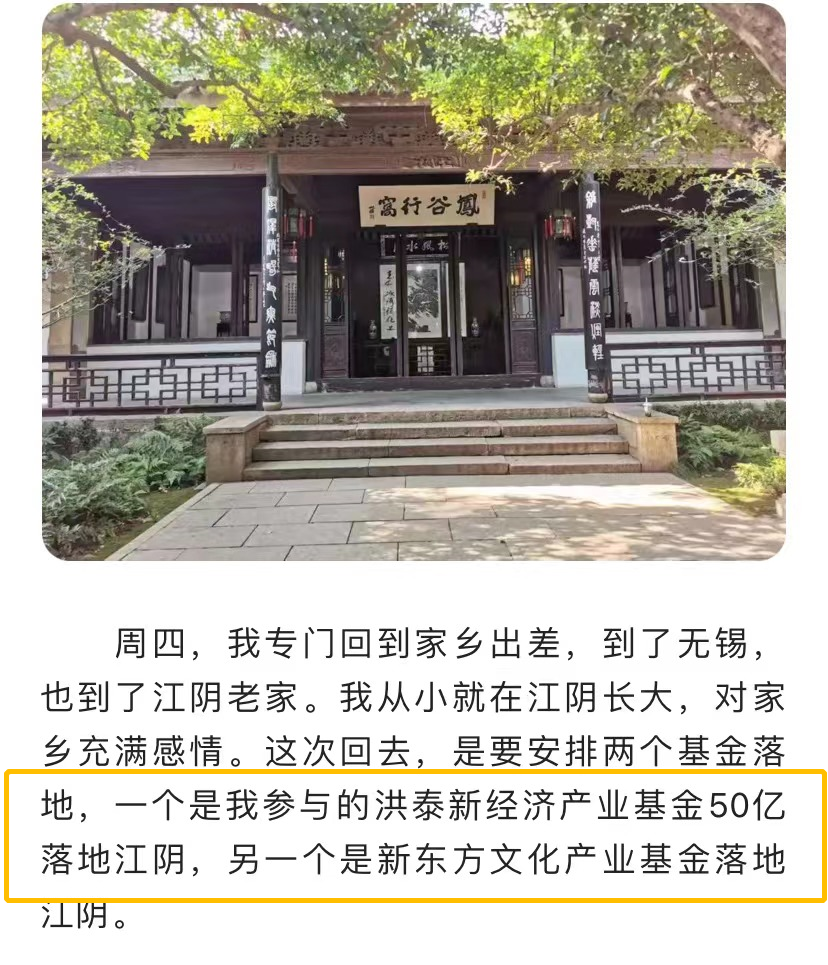 俞敏洪也分享了后期的两个基金落地项目:一个是他参与的洪泰新经济产业基金50亿落地江阴,另一个是新东方文化产业基金落地江阴。