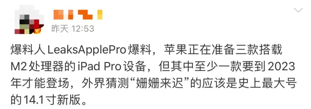 据知情人LeaksApplePro爆料:苹果正在准备三款搭载M2处理器的iPad Pro设备,但是其中至有一款或者两款要到2023年才能发布,外界纷纷猜测迟到的iPad Pro应该是史上最大号的iPad,有14.1寸。