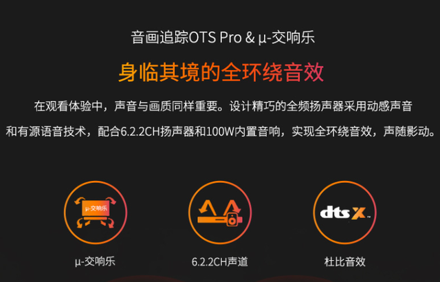 音效方面,这款电视配备了全频扬声器和整整100w功率内置音响,能够实现6.2.2声道的全环绕音效。