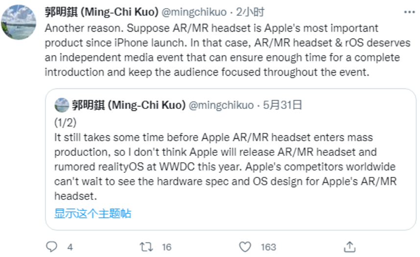 知名苹果爆料人郭明錤最近表示,苹果备受瞩目的AR头显有望在2023年1月亮相。