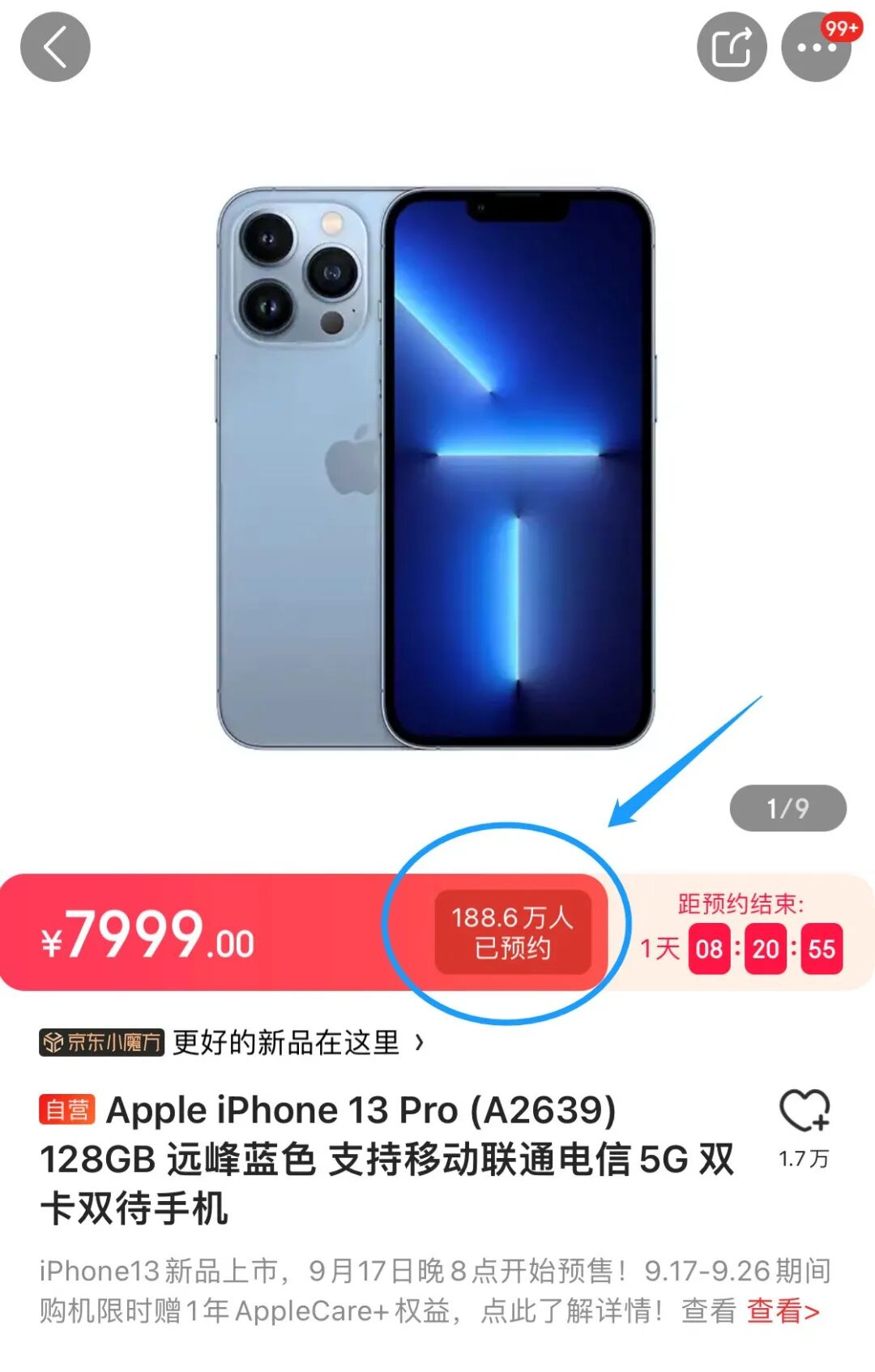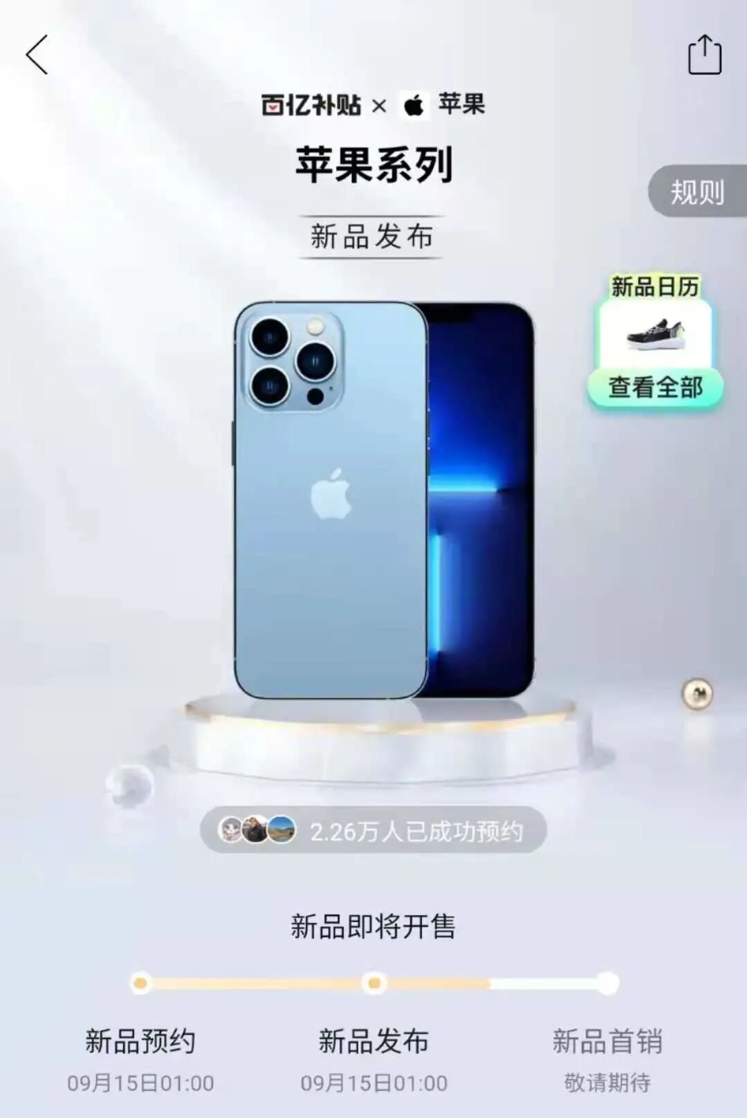 据报道,今天早上京东预约页面上线1小时后,iPhone 13系列预约人数已超过20万。