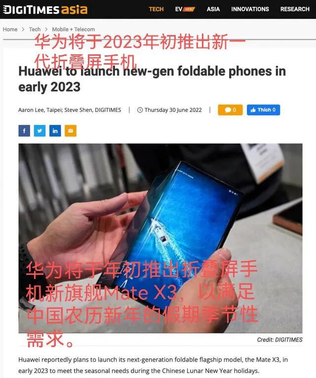 @IT之家@VDGER:6月30日,台湾电子时报称,华为近期敲定了旗下折叠屏手机新旗舰Mate X3的出货日期,预计将于11月开始量产,2023年初上市。