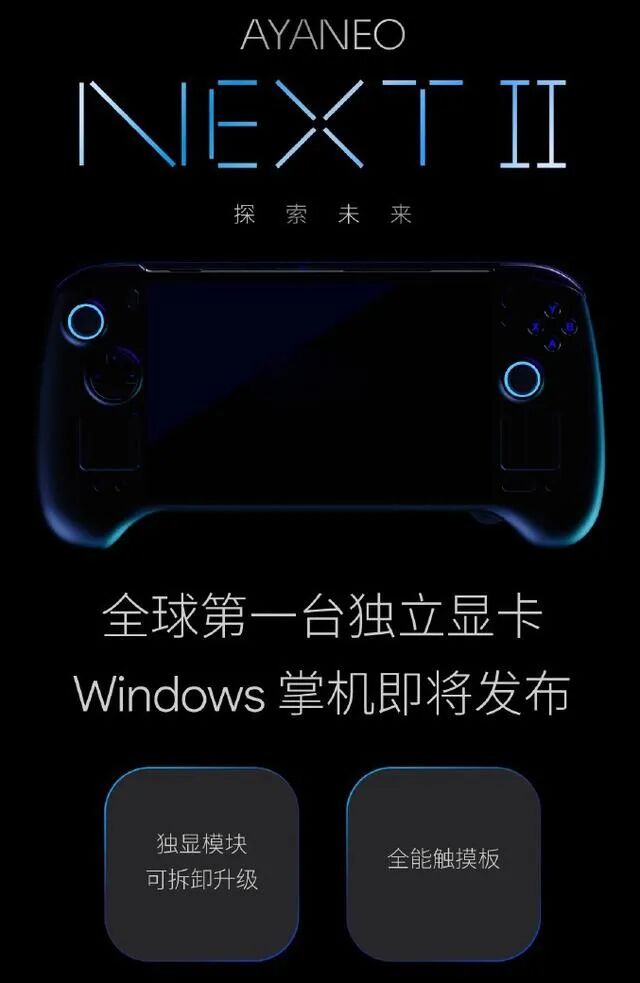 NEXT 2掌机将采用独显模块,可拆卸升级,同时配备了全能触摸板。