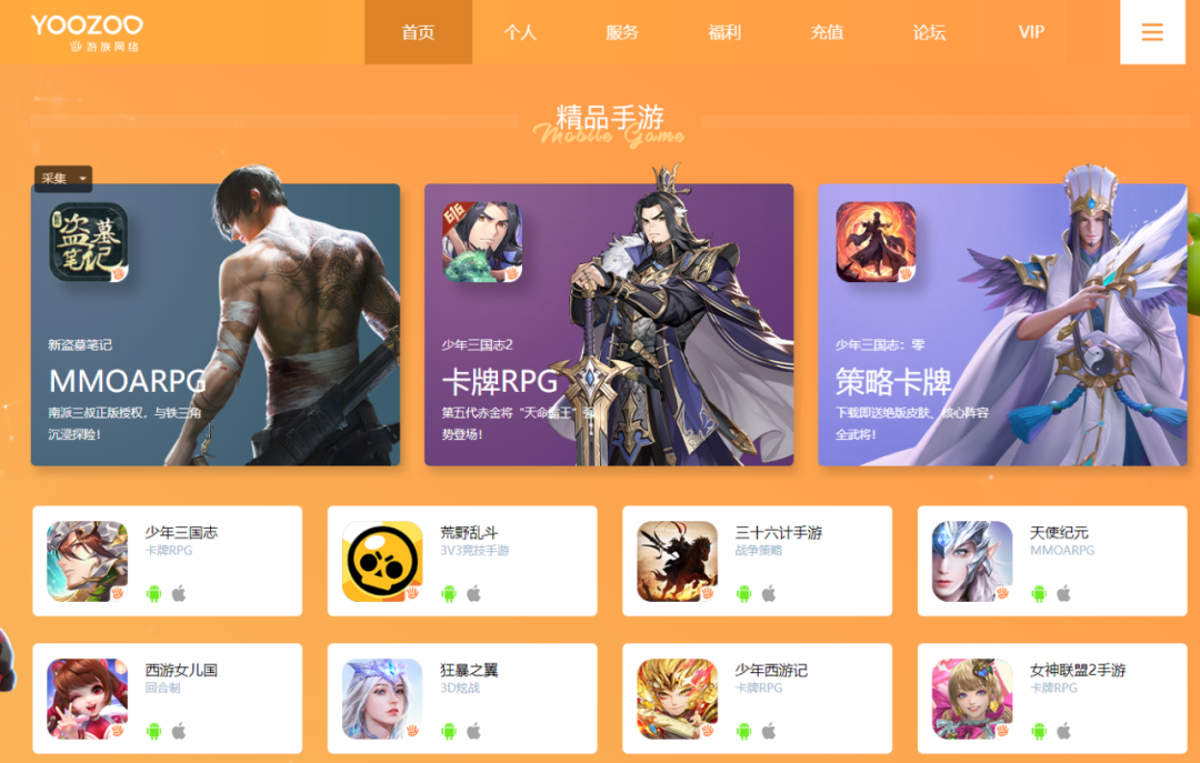 打开官网我们可以看到,基本清一色的都是手游,或者是页游。