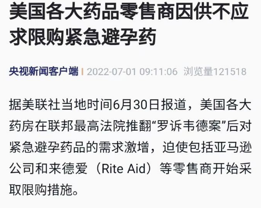 每日经济新闻:“堕胎禁令”后,美国紧急避孕药需求激增,有药店限购3片