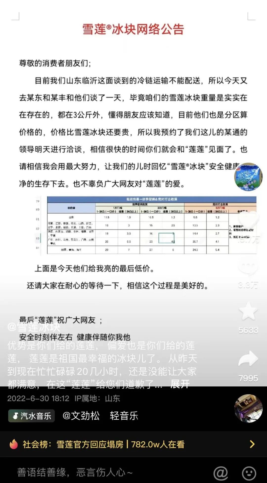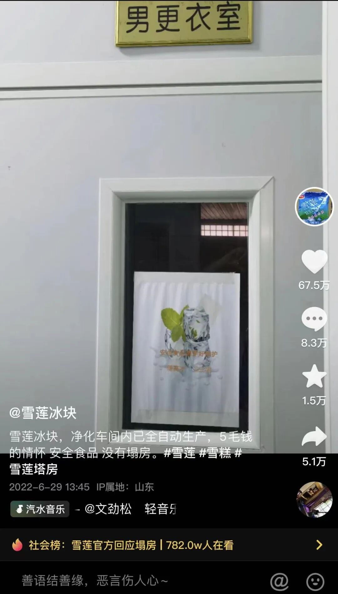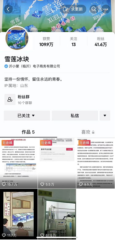 结果雪莲官方得知自己“被塌房”后,连夜注册了一个抖音号“雪莲冰块”。