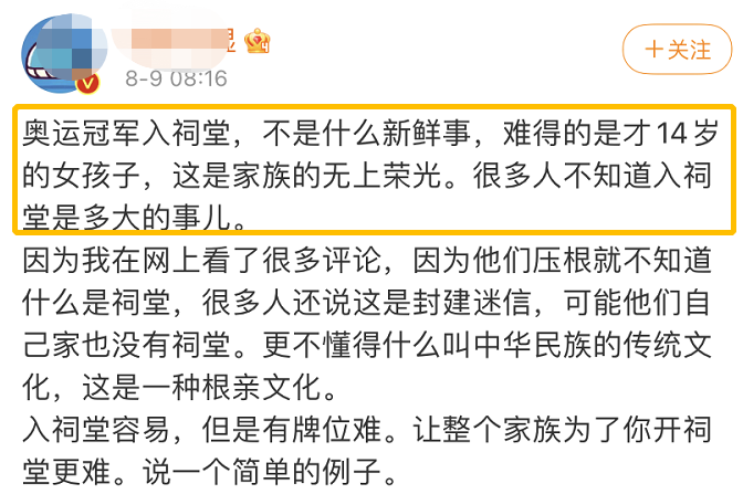 对此,某博主表示:“奥运冠军入祠堂算不上什么新鲜事,难得的是才14岁的女孩子,这是家族的无上荣光,就是入祠堂的一个标准,因为你是家族的荣耀。”