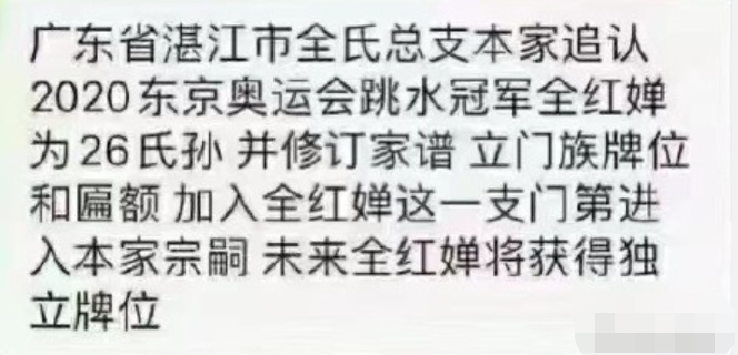 网传当地有消息称,全红婵打破了“女孩不入祠堂,名字不入族谱”的族规,广州市湛江市全氏总支本家追认奥运冠军全红婵为26氏孙。