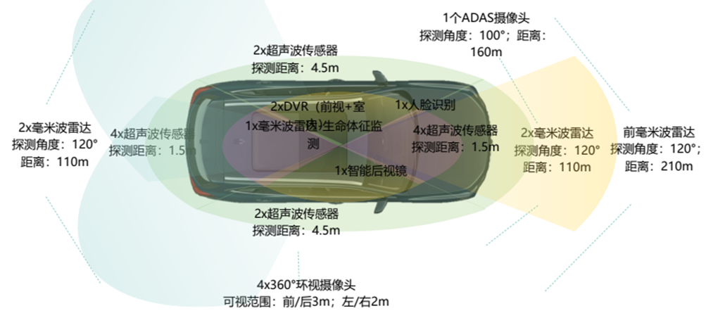 整车搭载27个超高精度探测装置、6个毫米波雷达、12个超声波雷达、9个摄像头。前后的探测范围分别达到了210米和110米,左右的探测范围也有4.5米。