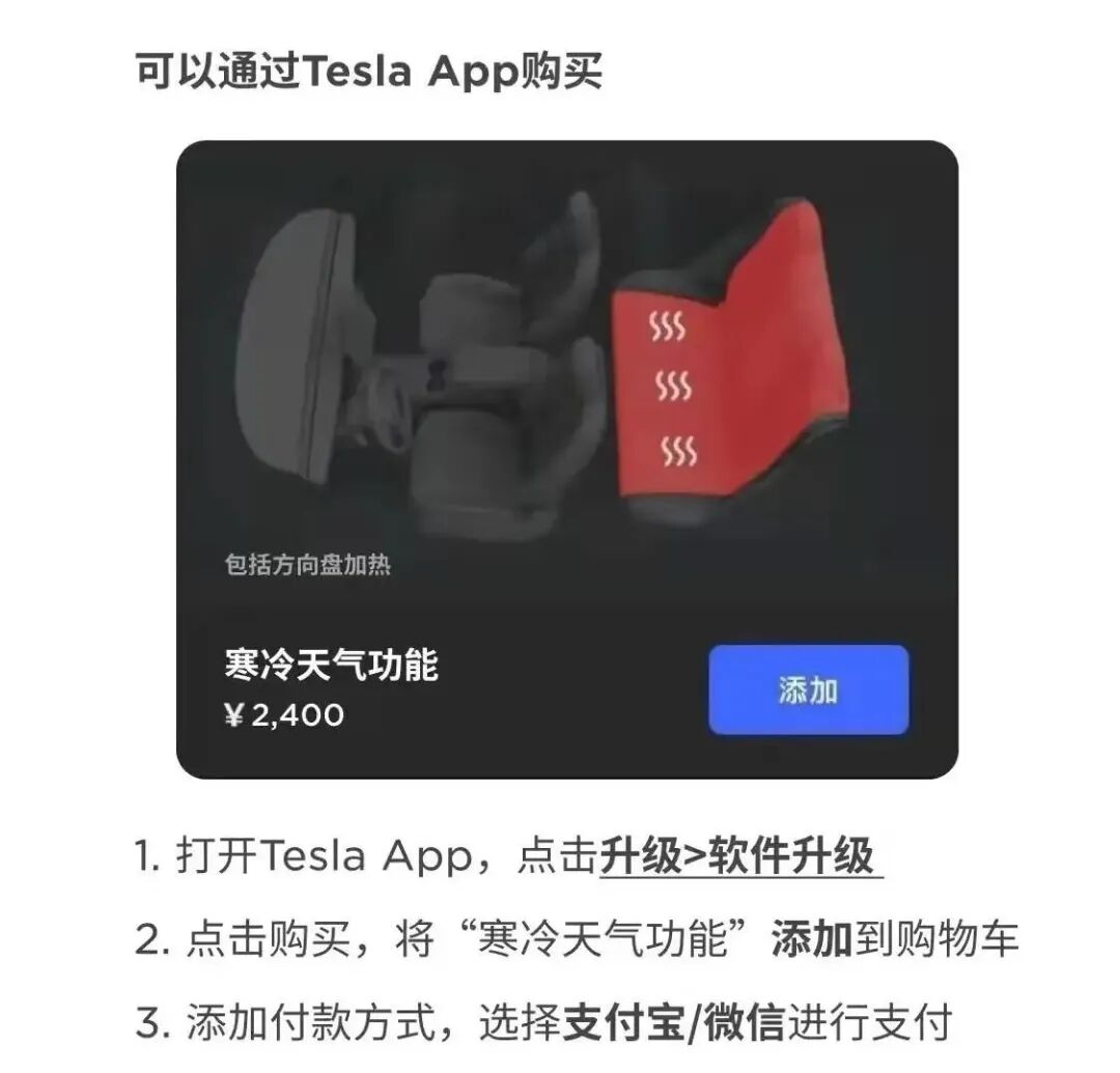 2020年9月,我们的老朋友特斯拉就推出了在线激活后排座椅加热的功能,收费是2400元。