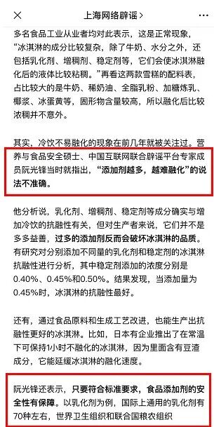 而上海网络辟谣官方账号随即也表示:不易融化不一定是添加剂多了。