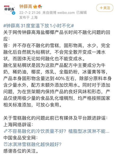 随着事情的持续发酵,钟薛高客服随后解释了为什么钟薛高在31度高温下放一小时都不化的原因。