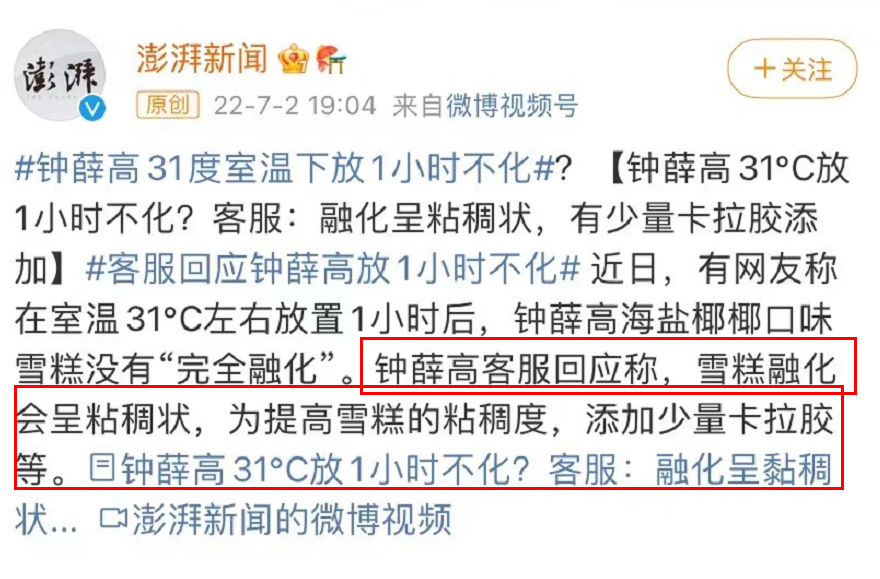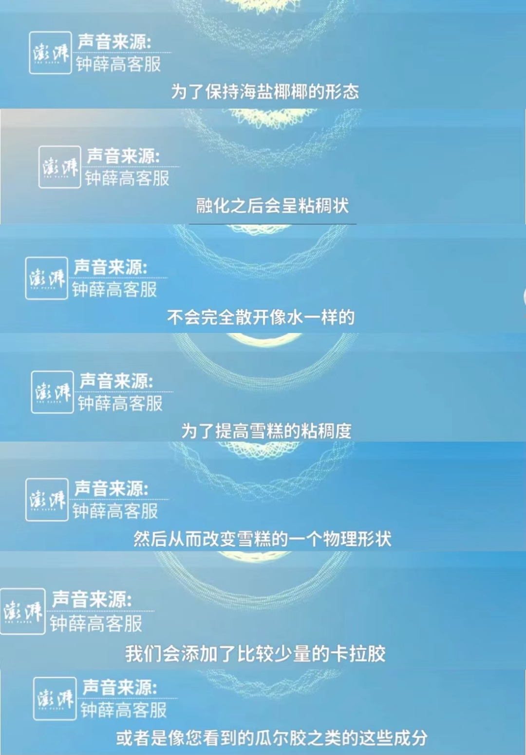 钟薛高的客服表示:那款海盐口味雪糕,除了水、牛奶、椰浆等之外,为提高雪糕的黏稠度,还会添加少量卡拉胶等添加剂,故而融化后会呈现黏糊状。
